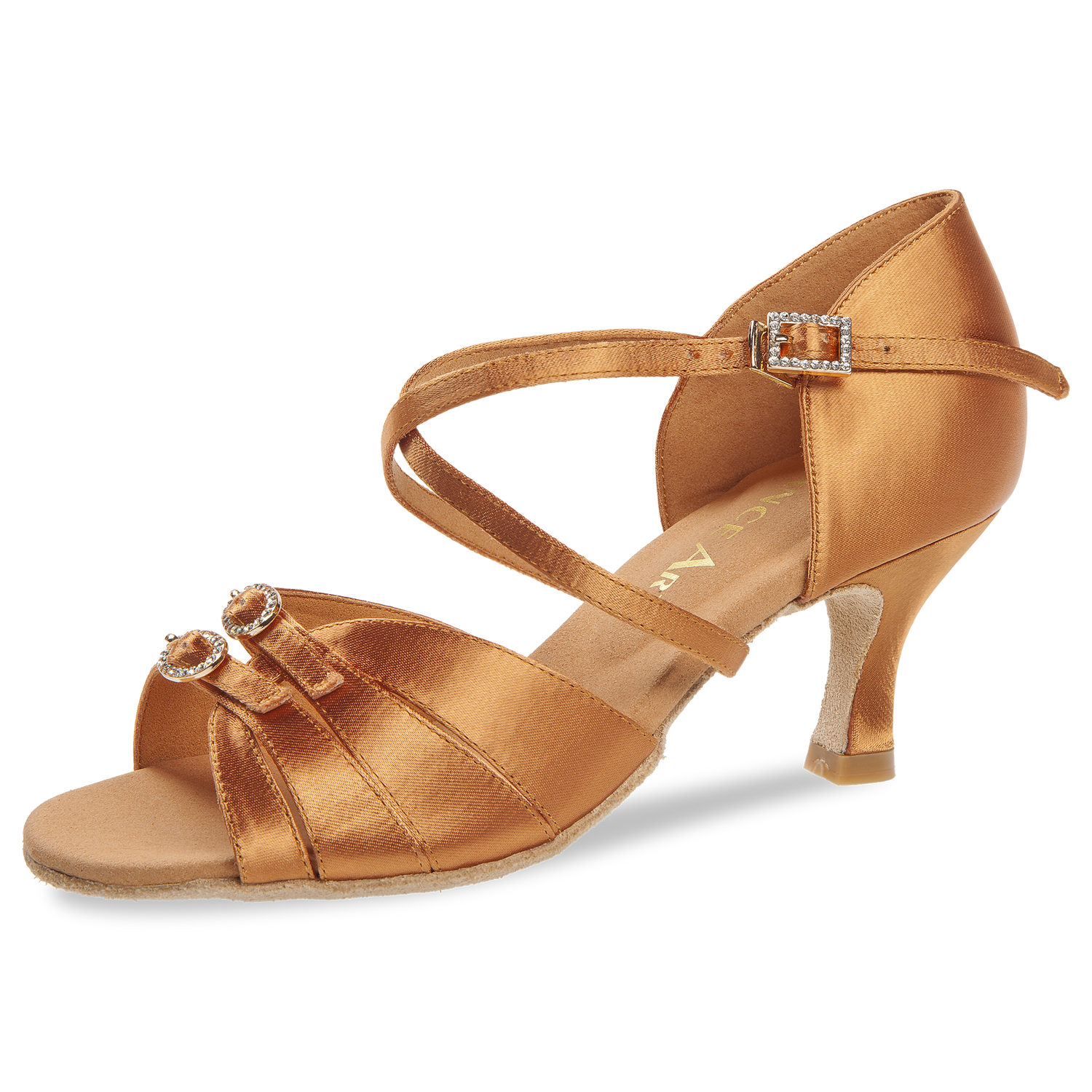 Mod. 220 DanceArt Damen Latein Turnierschuhe handgefertigt mit einem Vorderblatt mit 2 in den Weiten verstellbaren Dornschnallen die sich dem Fuß anpassen. Die zehenoffene Sandalette wird mit einem Fersenriemchen mit einer einstellbaren Dornschnalle gefertigt. Diese Turniersandale wird in der Weite F (Normalweite) mit einem 6,5 cm Flare Absatz hergestellt. Für das Obermaterial aus dark tan Satin wird erstklassiger Stoff verwendet.